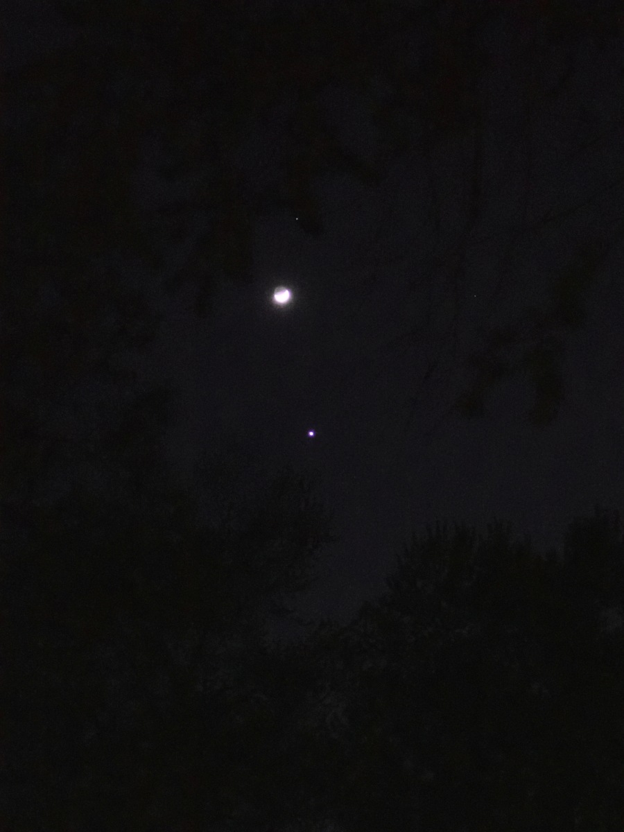 Morning conjunction between the crescent Moon and Venus. Olympus TG-6 Digital camera, ISO 6400, 1/8 second exposure. 100mm effective focal length.