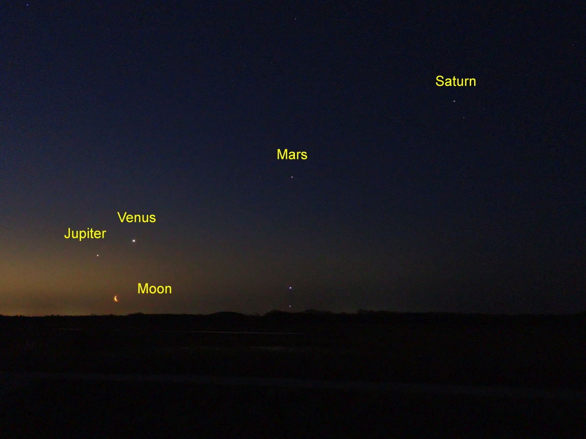 Morning alignment of Jupiter, Venus, Waning Crescent Moon, Mars, and Saturn. Olympus TG-6 Digital camera, ASA 100, 2.5 second exposure.