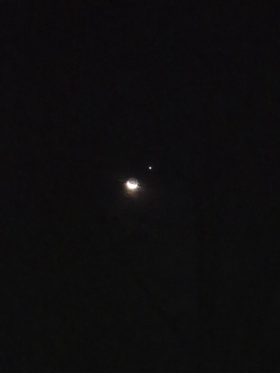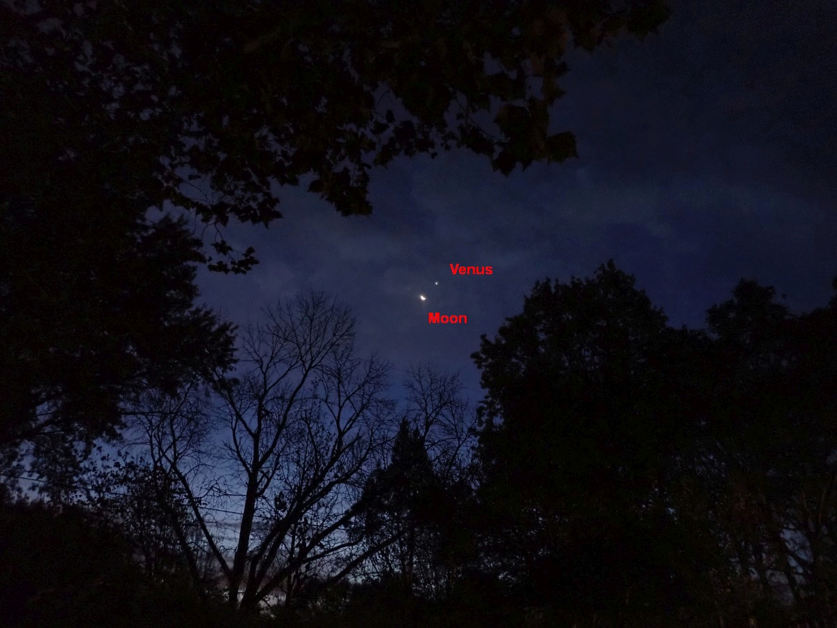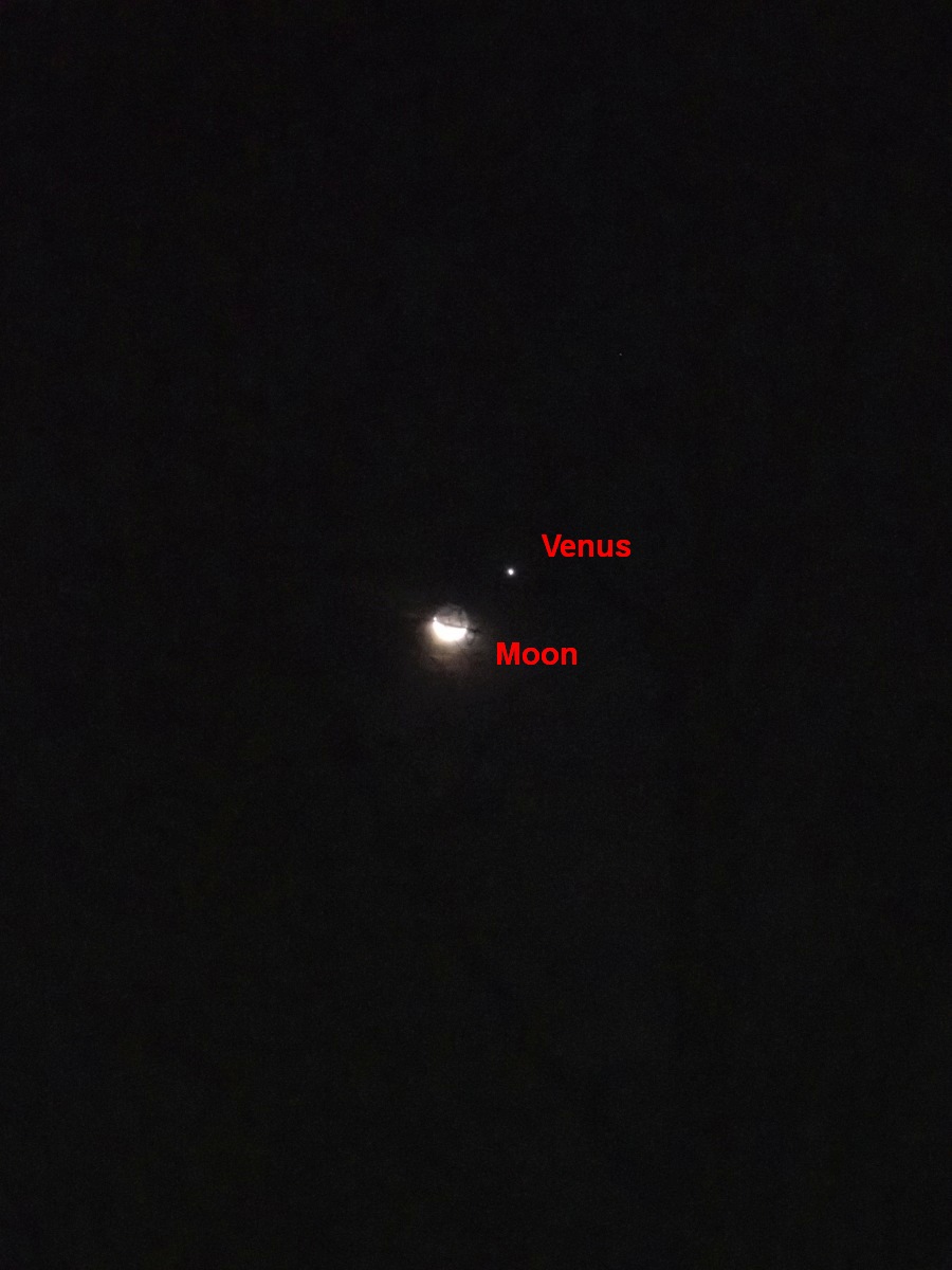 Morning conjunction between the crescent Moon and Venus. Olympus TG-6 Digital camera, ISO 1250, 1/8 second exposure. 25mm effective focal length.