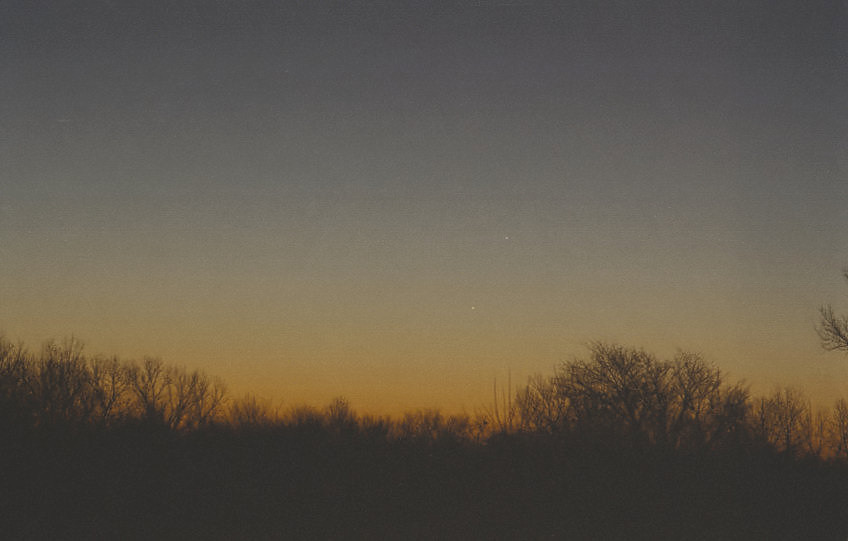 Conjunction of Jupiter and Saturn photographed with a Kodak C743 digital camera, mounted on a tripod, using a 4 second exposure at f/4.8. This image was taken at 00:07 UT along the side of County Road N 950 near the Rockhaven Public Use Area of Clinton Lake in Kansas. There were cirrus clouds present when I took this picture. The angular separation between Jupiter and Saturn was 0.11 degrees