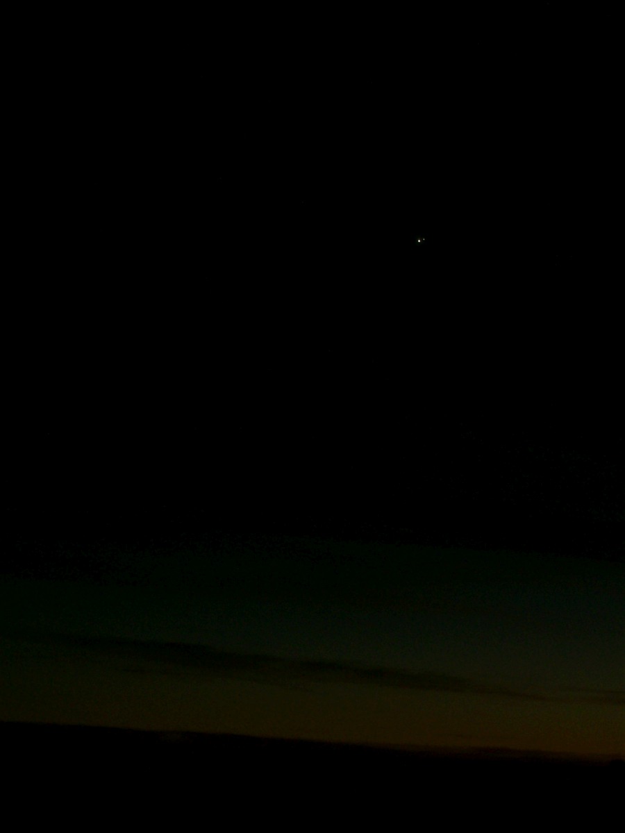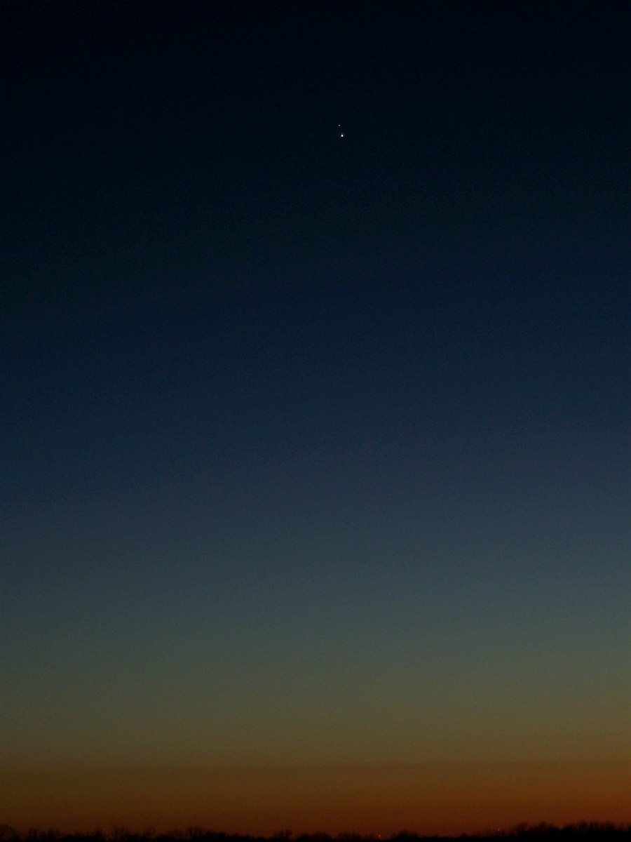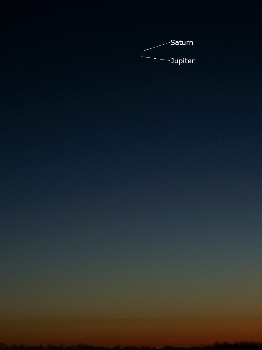 Conjunction of Jupiter and Saturn photographed with a Kodak C743 digital camera, mounted on a tripod, using a 2 second exposure at f/4.8. This image was taken at 23:50 UT along the side of County Road N 950 near the Rockhaven Public Use Area of Clinton Lake in Kansas. The angular separation between Jupiter and Saturn was 0.22 degrees