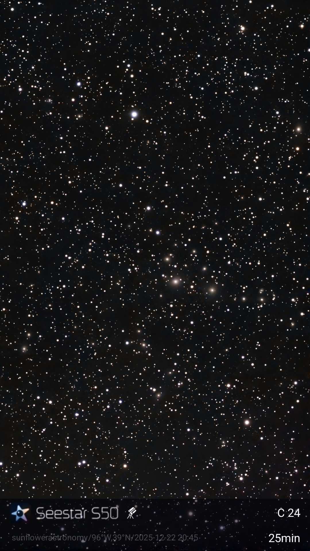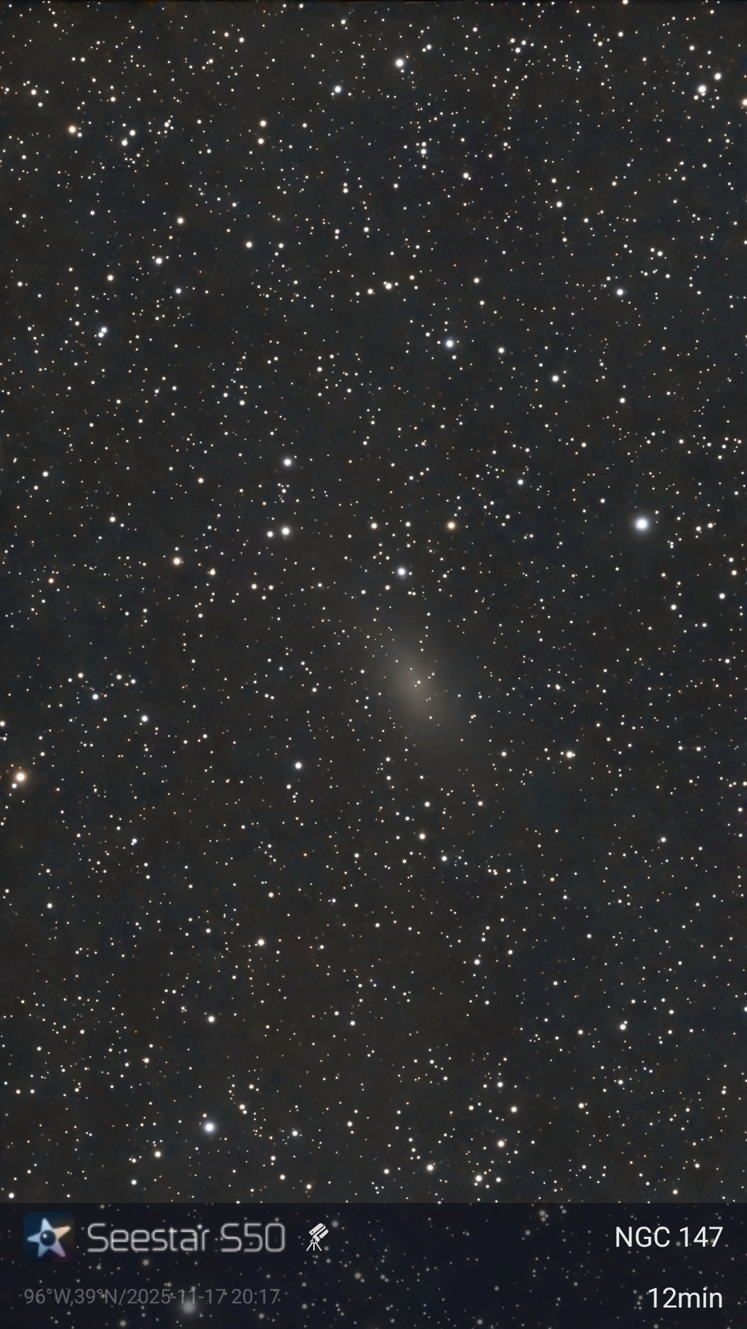 NGC 147. This galaxy is a dwarf spheroidal galaxy that is a satellite of the Andromeda Galaxy. This image consists of 36 twenty second exposures. My Seestar S50 was in equatorial mode. Noise filtering and curves were done with the Seestar App, Siril and The Gimp.