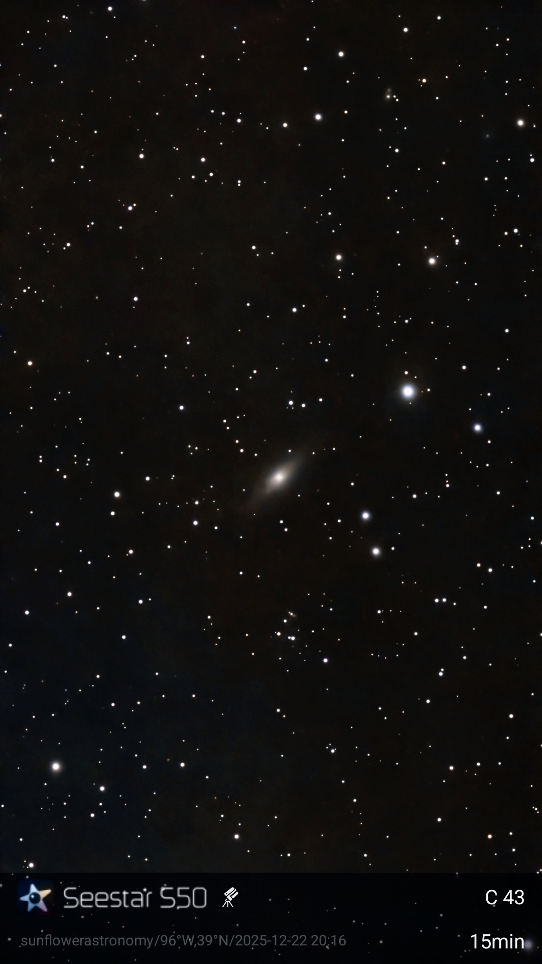 M108. This image consists of 24 thirty second exposures using my Seestar S50 in equatorial mode. Noise filtering, levels and, curves were done with the Seestar App, Siril and The Gimp.