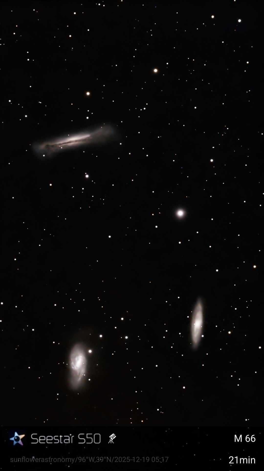 Leo Triplet. The triplet consists of the galaxies M65, M66, and NGC3628. This image consists of 42 thirty second exposures using my Seestar S50 in equatorial mode. Noise filtering, levels and, curves were done with the Seestar App, Siril and The Gimp.