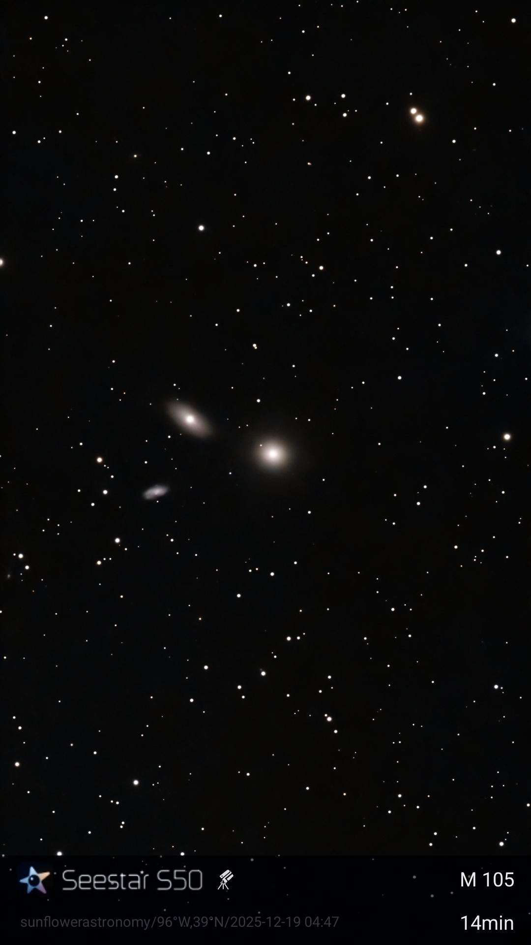 M105 is the large elliptical galaxy in the center. The other two galaxies to its left are NGC 3384 (upper left) and NGC 3389 (lower left). This image consists of 28 thirty second exposures using my Seestar S50 in equatorial mode. Noise filtering, levels and, curves were done with the Seestar App, Siril and The Gimp.