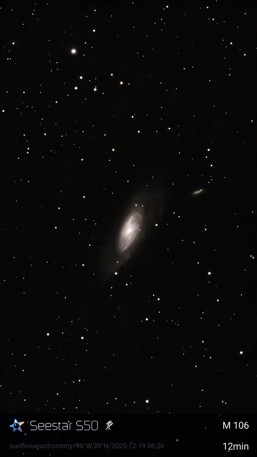 M106. This image consists of 24 thirty second exposures using my Seestar S50 in equatorial mode. Noise filtering, levels, and curves were done with the Seestar App, Siril and The Gimp.