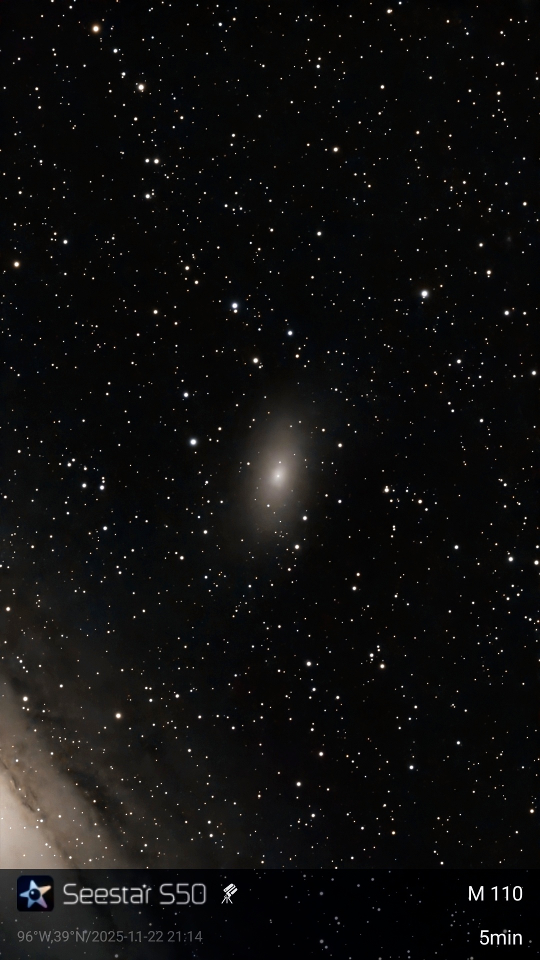 M110. This image consists of 82 thirty second exposures. My Seestar S50 was in equatorial mode. Noise filtering and curves were done with the Seestar App, Siril and The Gimp.