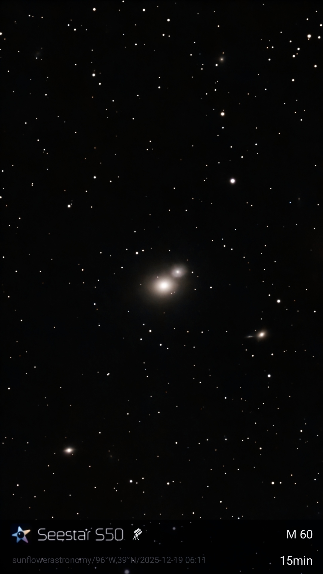 M60 is the elliptical galaxy in the center of the image and one of the galaxies in the Virgo Cluster. The smaller galaxy to its upper right is NGC 4647 and is another member of the Virgo Cluster. If you look closely at the image you will see other members of the Virgo cluster. This image consists of 30 thirty second exposures using my Seestar S50 in equatorial mode. Noise filtering, levels and, curves were done with the Seestar App, Siril and The Gimp.