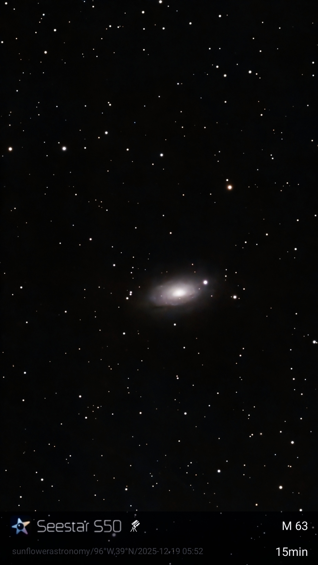 M63. This image consists of 30 thirty second exposures using my Seestar S50 in equatorial mode. Noise filtering, levels and, curves were done with the Seestar App, Siril and The Gimp.
