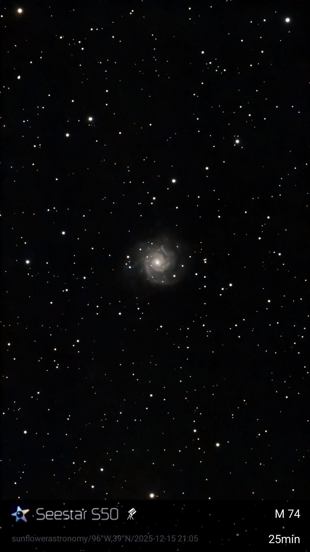 M74. This image consists of 50 thirty second exposures. My Seestar S50 was in equatorial mode. Noise filtering and curves were done with the Seestar App, Siril and The Gimp.