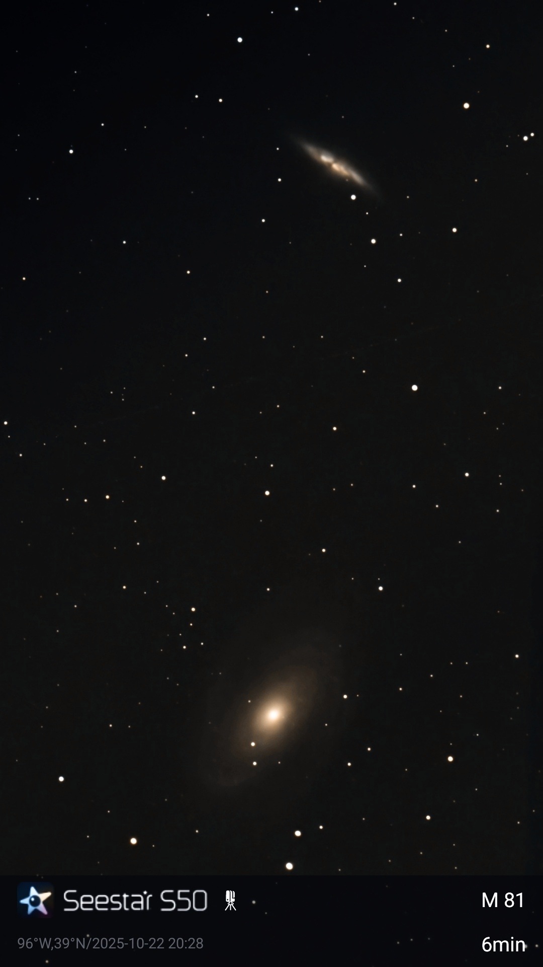 M81 and M82. This image consists of 36 ten second exposures. Noise filtering and curves were done with the Seestar App and The Gimp.