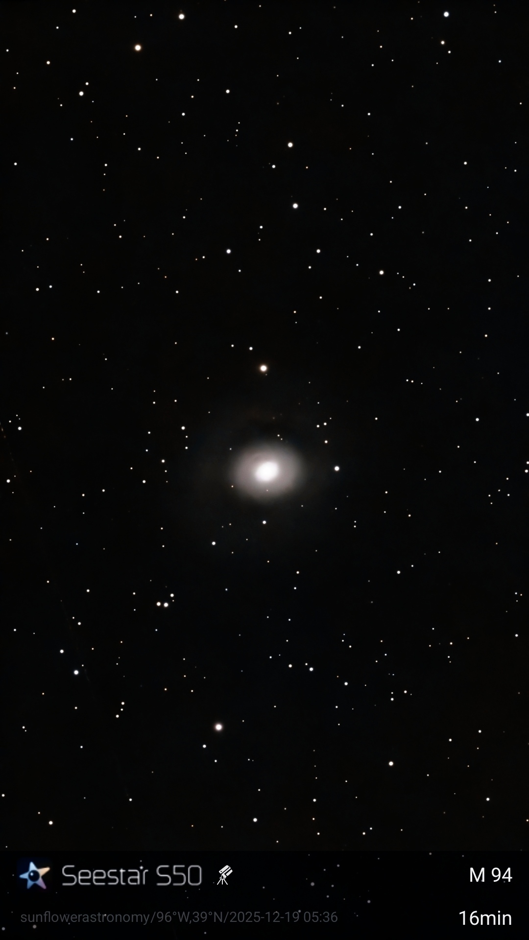 M94. This image consists of 32 thirty second exposures using my Seestar S50 in equatorial mode. Noise filtering, levels and, curves were done with the Seestar App, Siril and The Gimp.