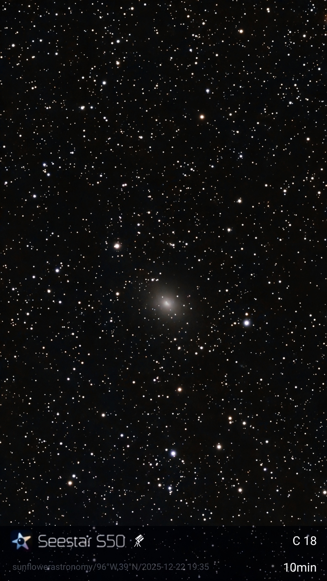 NGC 185 (also known as Caldwell 18). This image consists of 20 thirty second exposures using my Seestar S50 in equatorial mode. This ia a dwarf spheroidal galaxy that is a satellite of the Andromeda Galaxy. Noise filtering, levels and, curves were done with the Seestar App, Siril and The Gimp.