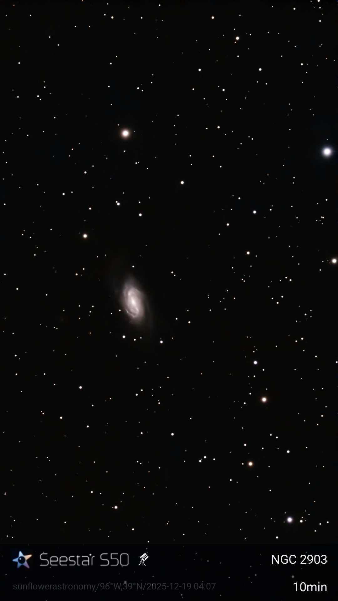 NGC 2903. This image consists of 10 thirty second exposures using my Seestar S50 in equatorial mode. Noise filtering, levels and, curves were done with the Seestar App, Siril and The Gimp.