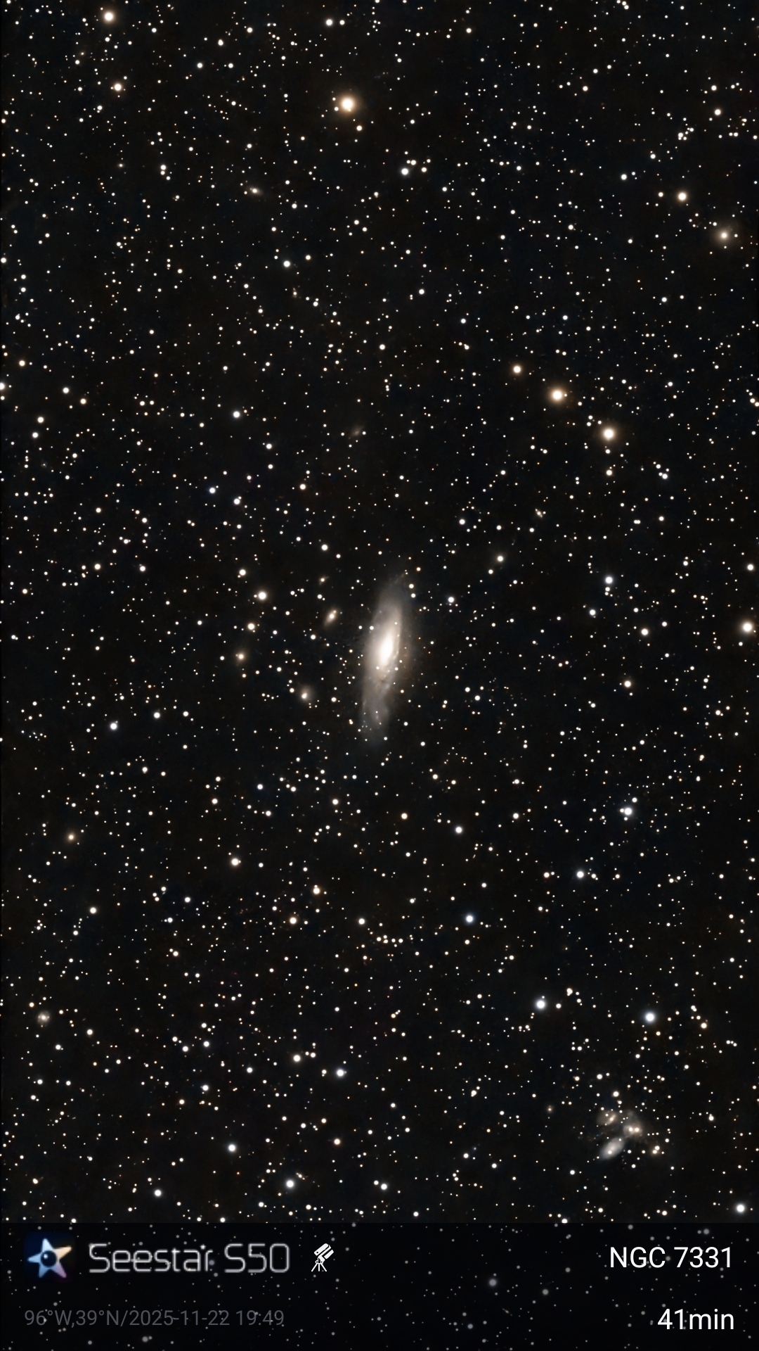 NGC 7331. This image consists of 82 thirty second exposures. My Seestar S50 was in equatorial mode. Noise filtering and curves were done with the Seestar App, Siril and The Gimp.