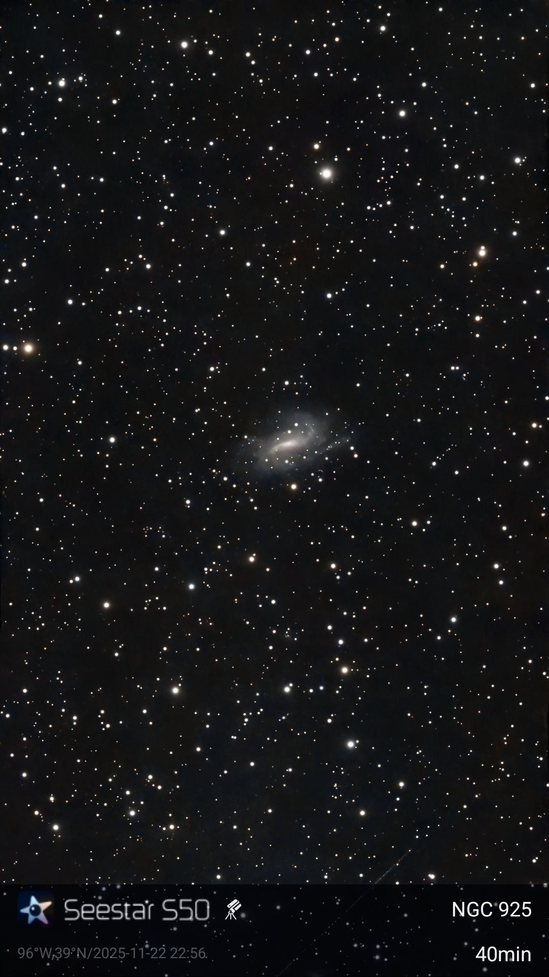 NGC925. This image consists of 80 thirty second exposures. My Seestar S50 was in equatorial mode. Noise filtering and curves were done with the Seestar App, Siril and The Gimp.