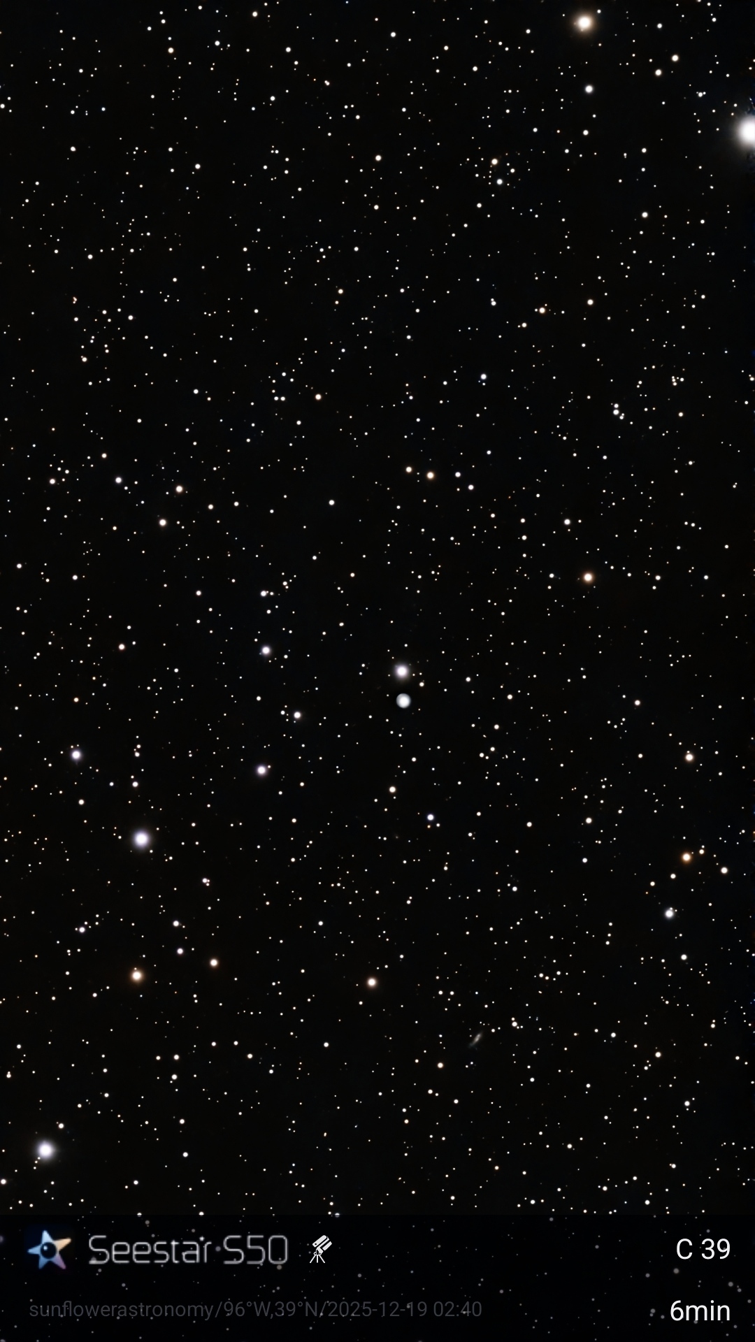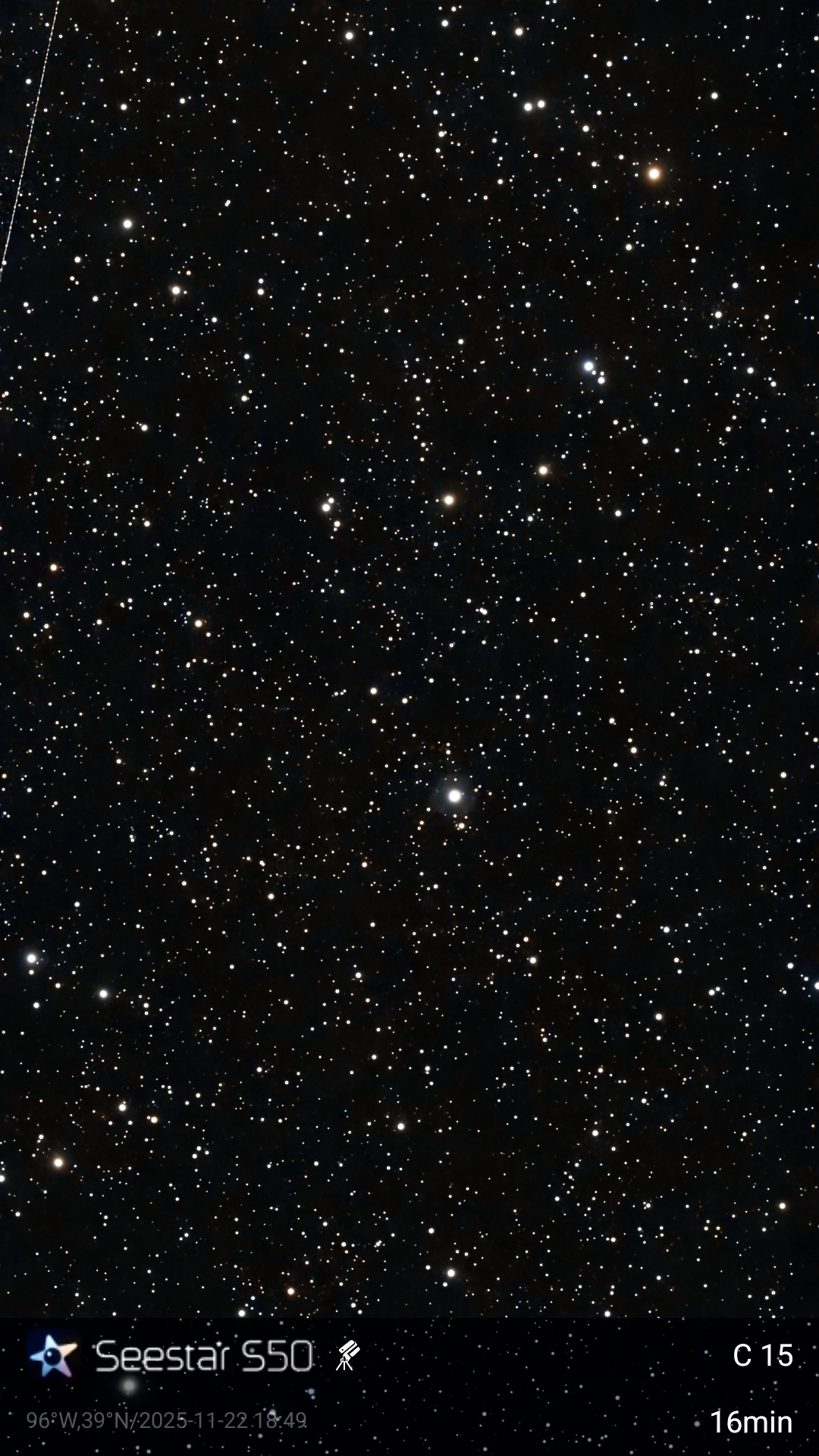 Caldwell 39 (Eskimo Nebula) photographed with a ZWO Seestar S50 smart telescope in equatorial mode. It is a planetary nebula, which is the remnant of a star like our Sun that has died. This image is a stack of 12 thirty second exposures. The nebula is the small green spot near the center of the image. The final processing (noise filtering and curves) was done with the Seestar App, Siril, and The Gimp. This object is almost too small to image with the Seestar.