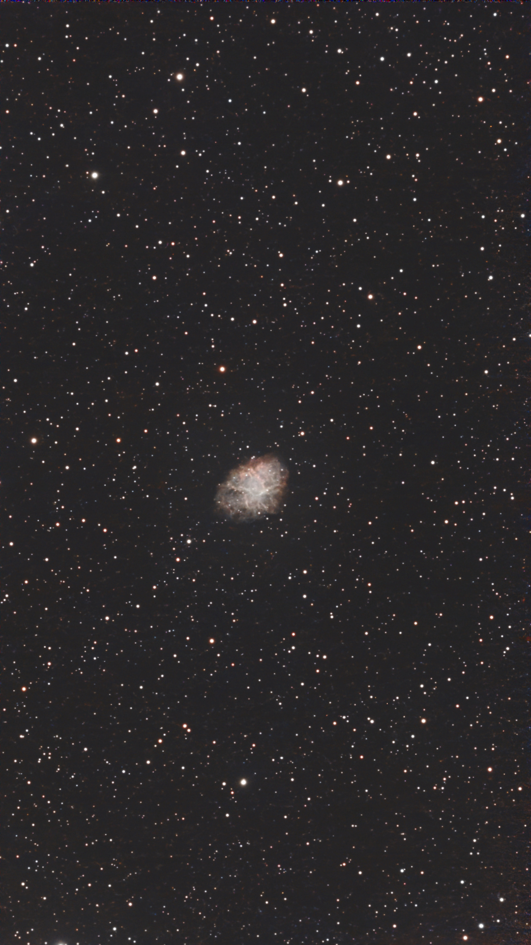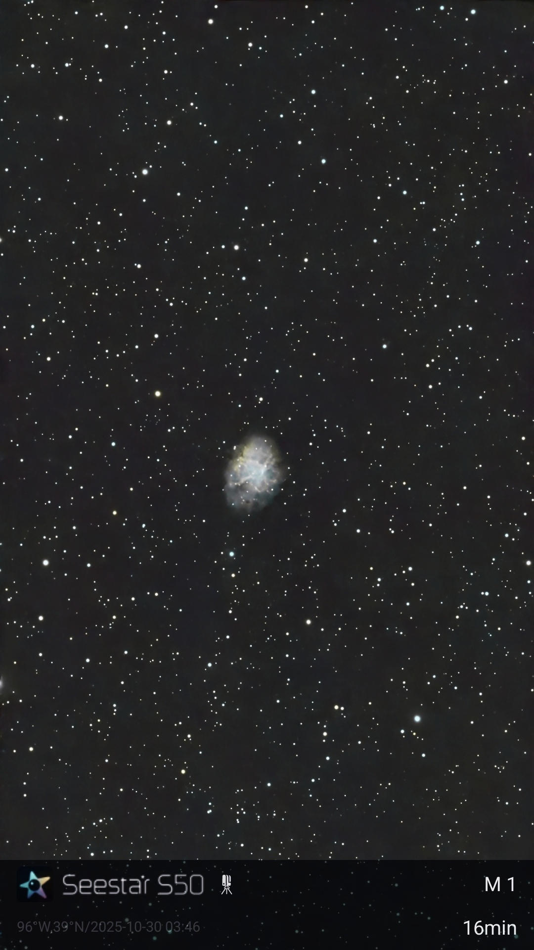 M1 (Crab Nebula) photographed with a ZWO Seestar S50 smart telescope. It is the remnant of a supernova that exploded in the year 1054 C.E. This image is a stack of 96 ten second exposures. The final processing (noise filtering and curves) was done with the Seestar App, Siril, and The Gimp.