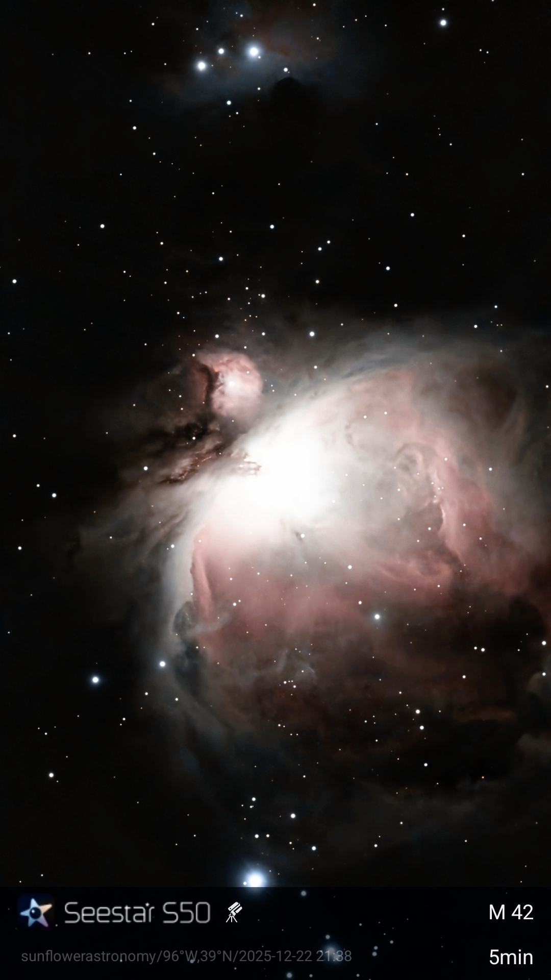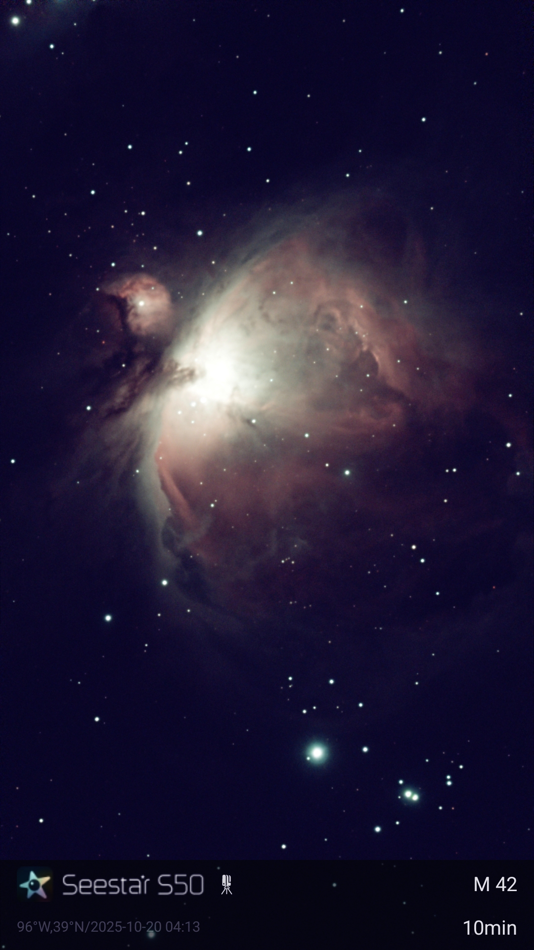 M42 (Orion Nebula) photographed with a ZWO Seestar S50 smart telescope in equatorial mode. This image is a stack of 10 thirty second exposures. The final processing (noise filtering and curves) was done with the Seestar App, Siril, and The Gimp.