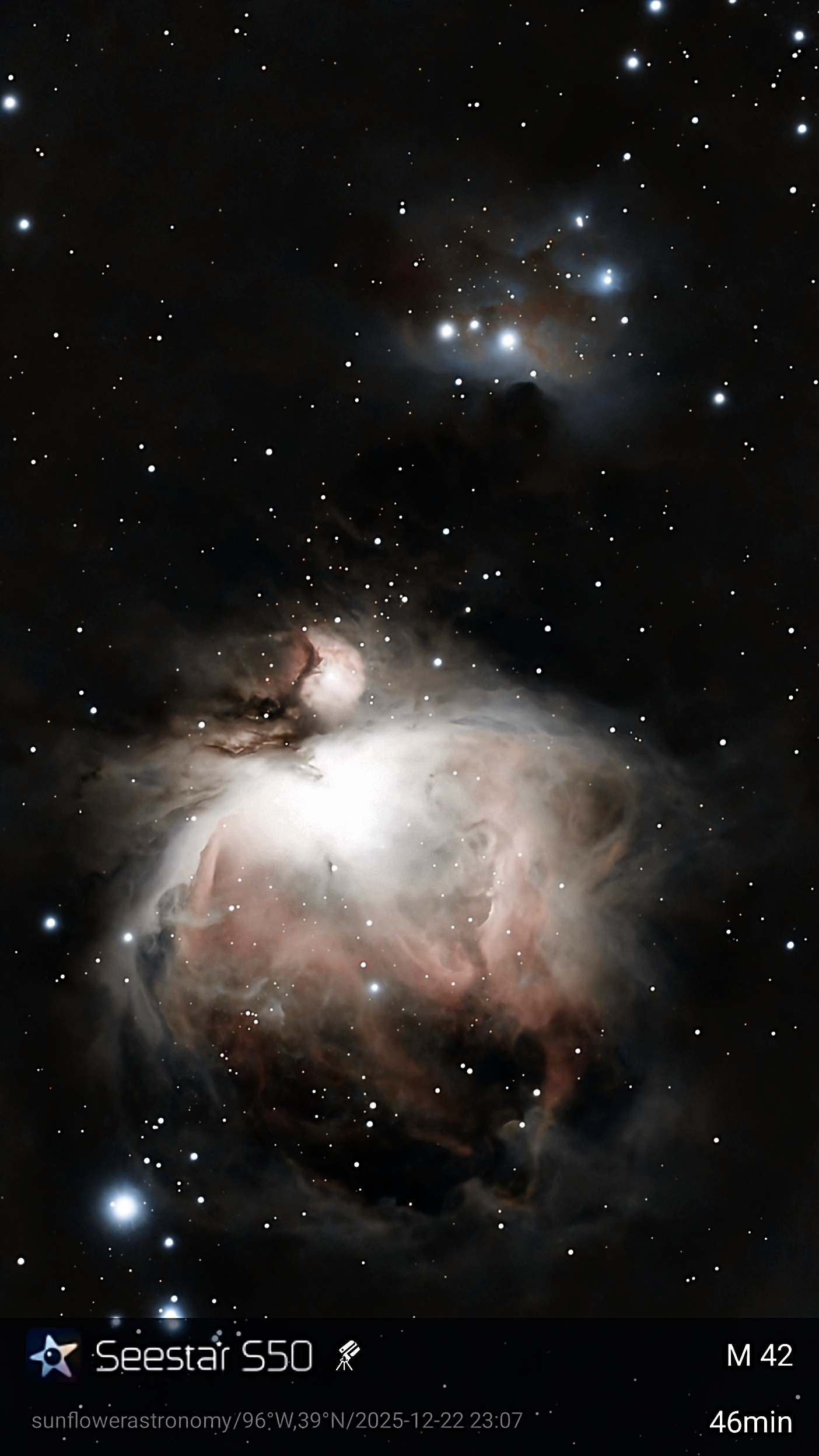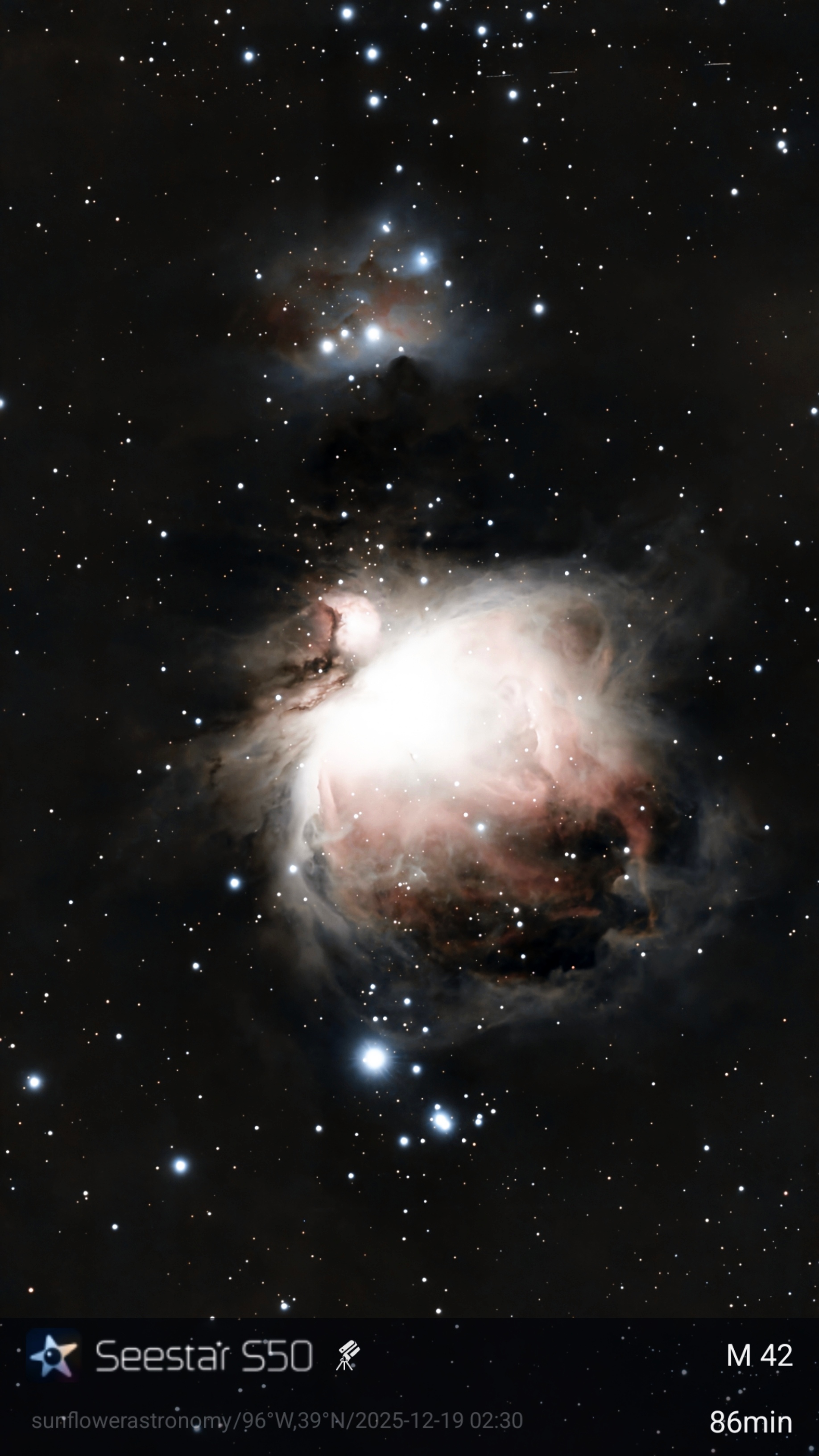 M42 (Orion Nebula) photographed with a ZWO Seestar S50 smart telescope in equatorial mode. This image is a mosaic created within the Seestar App using a magnification of 1.7. The mosaic consists of 516 ten second exposures. The final processing (noise filtering and curves) was done with the Seestar App, Siril, and The Gimp. The image is oversaturated and shows some artifacts from the mosaic creation process.