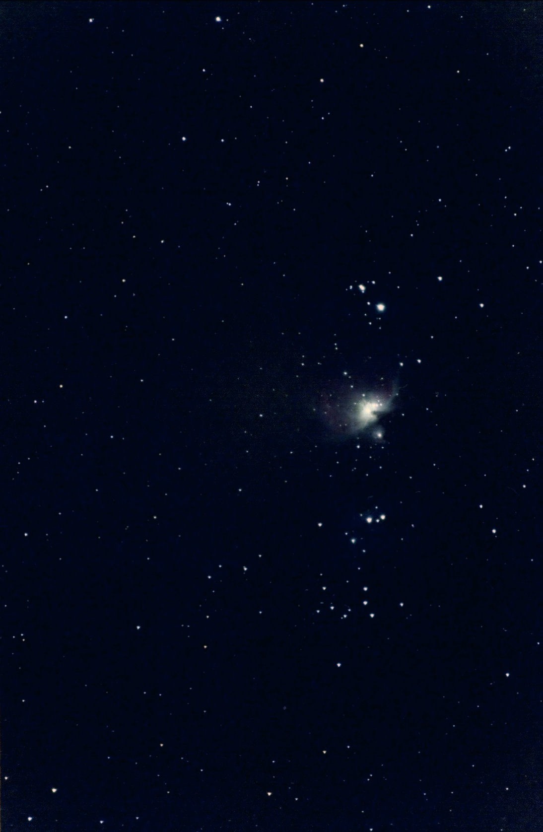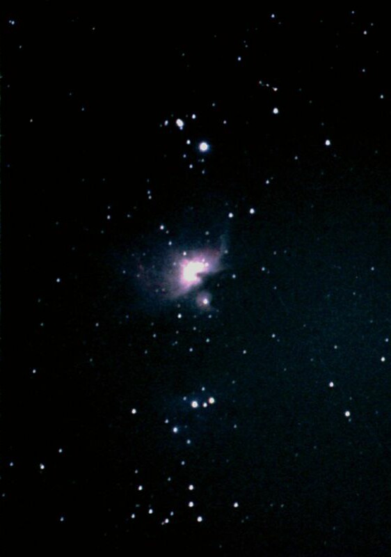 Two ~15 second unguided exposures on Polaroid 800 ASA film stacked with Registax. Image was taken at the prime focus of my 8 inch SCT. In this image you can see the Trapezium, which are the stars that ionize the gases in the Orion Nebula. Colors were adjusted with Paint Shop Pro version 9.