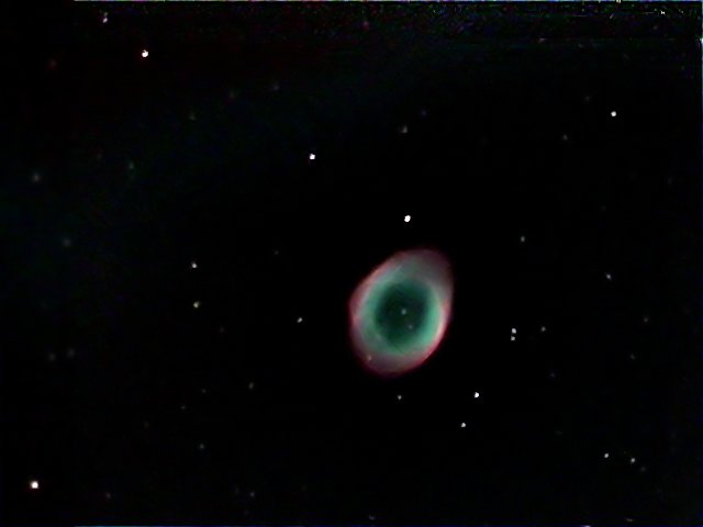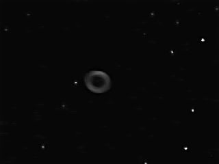 M57 (The Ring Nebula in Lyra). Unguided photograph with a SAC7 CCD camera. 12 - 15 second exposures stacked with Registax after subtracting the dark frames with AIP. Noise filtered with Ulead PhotoImpact and NEAT Image. Intensity adjustments and unsharp mask applied with PSP. Image was captured from Grayling, MI USA.