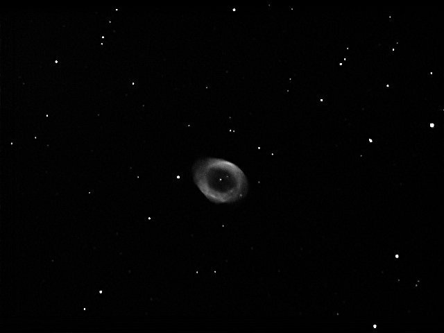 M57 (Ring Nebula) photographed with a Watec 120N integrating CCD camera. 77x256 frames stacked. The limiting magnitude in this image is about 18th magnitude.