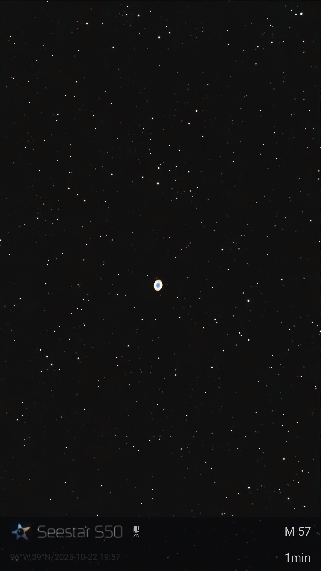 M57 (Ring Nebula) photographed with a ZWO Seestar S50 smart telescope. This image is a stack of 6 ten second exposures. The final processing (noise filtering and curves) was done with the Seestar App, Siril, and The Gimp.