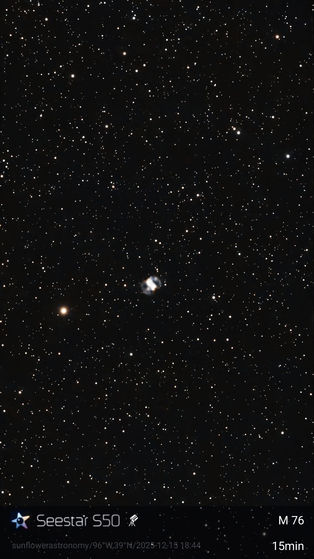 M76 photographed with a ZWO Seestar S50 smart telescope in equatorial mode. It is a planetary nebula, which is the remnant of a star like our Sun that has died. This image is a stack of 45 thirty second exposures. The final processing (noise filtering and curves) was done with the Seestar App, Siril, and The Gimp.