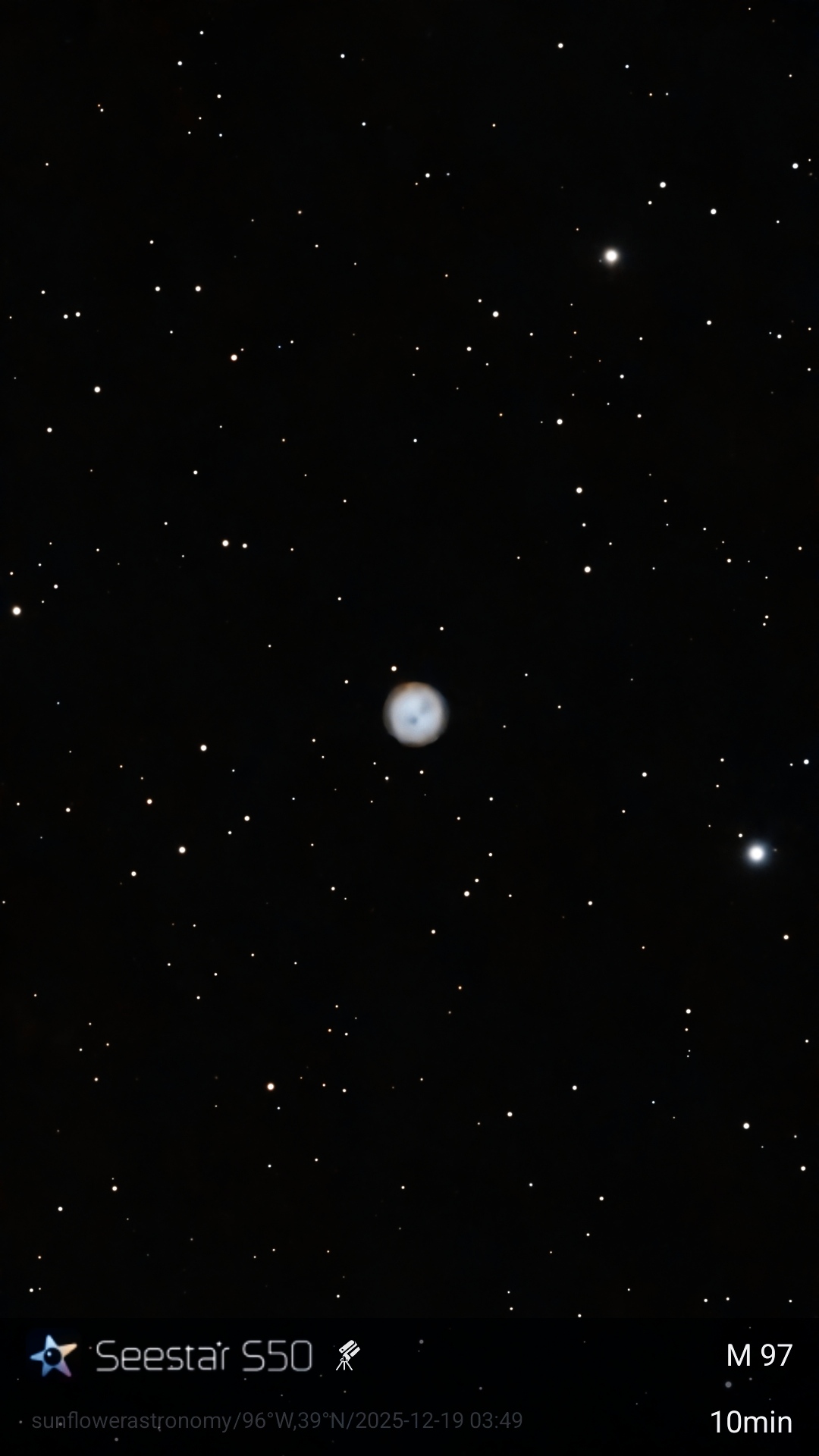 M97 (Owl Nebula) photographed with a ZWO Seestar S50 smart telescope in equatorial mode. It is a planetary nebula, which is the remnant of a star like our Sun that has died. This image is a stack of 12 thirty second exposures. The nebula is the small green spot near the center of the image. The final processing (noise filtering and curves) was done with the Seestar App, Siril, and The Gimp.