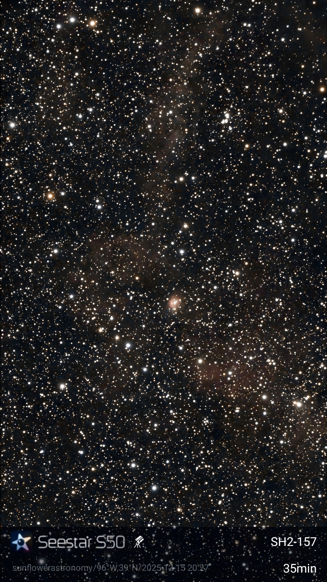 SH2-157 (Lobster Claw Nebula) photographed with a ZWO Seestar S50 smart telescope in equatorial mode. This image only captures about half of the nebula. This image is a stack of 70 thirty second exposures. The final processing (noise filtering and curves) was done with the Seestar App, Siril, and The Gimp.