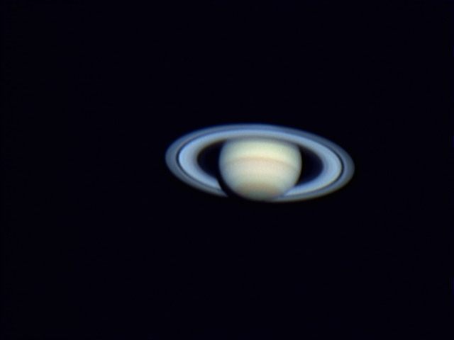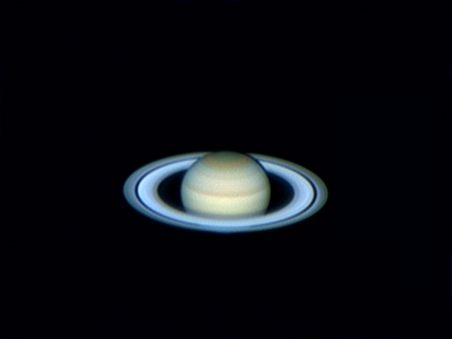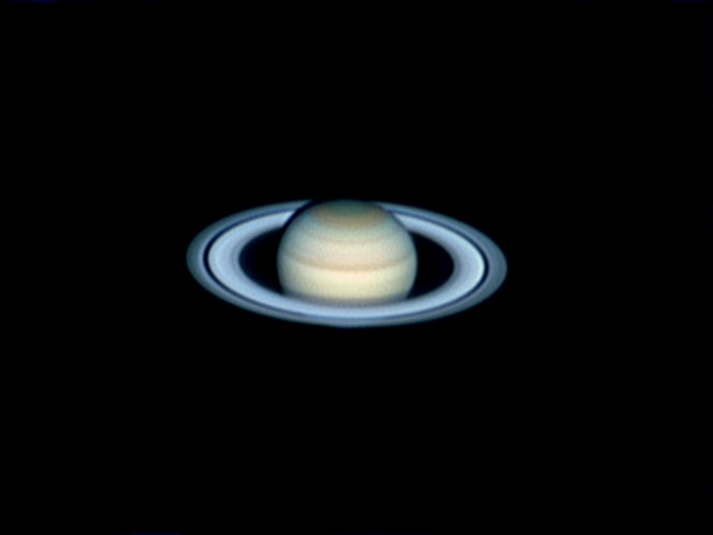 1000 frames stacked. Camera set in 640x480 mode. 3X barlow. Seeing was average to good (~3 to 4 out of 5). South is down. Large scale turbulence caused the "ghost" image just to the right of the planet's disk and rings. Angular diameter 19.9".