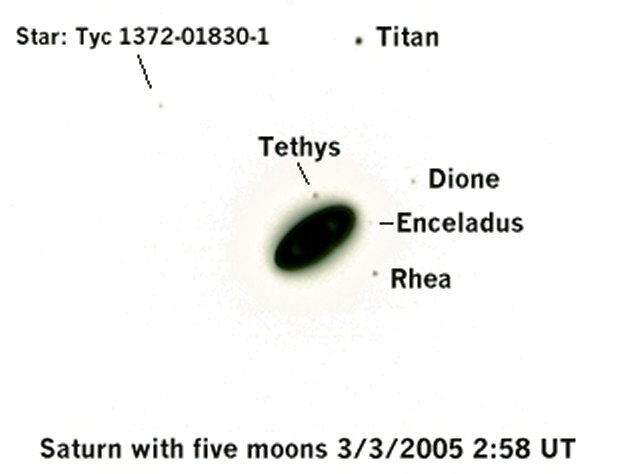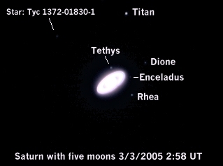 The following negative image on the right has been enlarged 2 times and does a better job of showing the moons. The visual magnitudes of the moons are as follows: Titan: 8.28, Dione: 10.4, Enceladus: 11.7, Tethys: 10.2, and Rhea: 9.7.