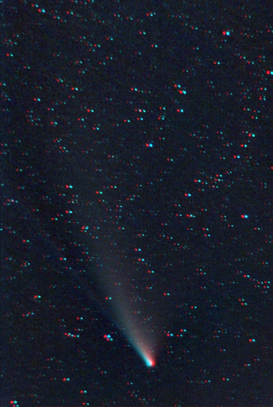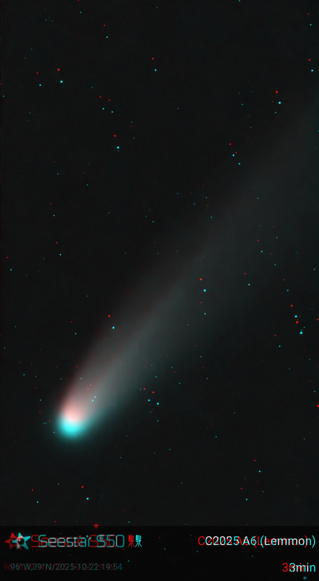 Comet Lemmon stereo image created from two images taken with my Seestar S50 smart telescope. The images were taken five minutes apart.