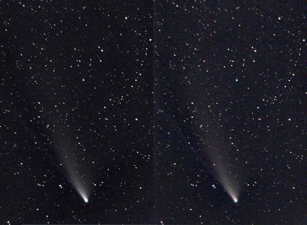 Comet NEOWISE Stereo Pair. Photographs taken with a ZWO ASI178 CMOS camera and a vintage Olympus 35mm f/2.8 lens mounted on a tripod. The two images were captured on July 25, 2020 and show the motion of the comet with respect to the background stars. The left image was taken at 10:09 PM and the right image was taken at 11:13 PM.