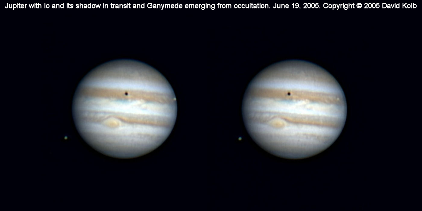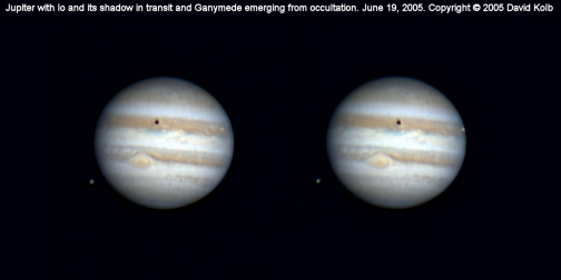 Jupiter Stereo Pair. Photographs taken with an 8" Meade LXD55 SCT and ToUcam Pro in 640x480 mode. The two images were captured on June 19, 2005. I created a blank image in Paint Shop Pro and pasted the two Jupiter images in as separate layers so that I could easily adjust their spacing. The larger image is best viewed from a distance of 3/4 meter to 1 meter. The smaller image is best viewed at a distance of about 1/3 meter. Stare at the images so that they merge together by looking cross-eyed. Jupiter and its two moons (Io and Ganymede) will then pop out in 3D. The third image is designed to be printed off for use in a stereo viewer.