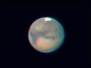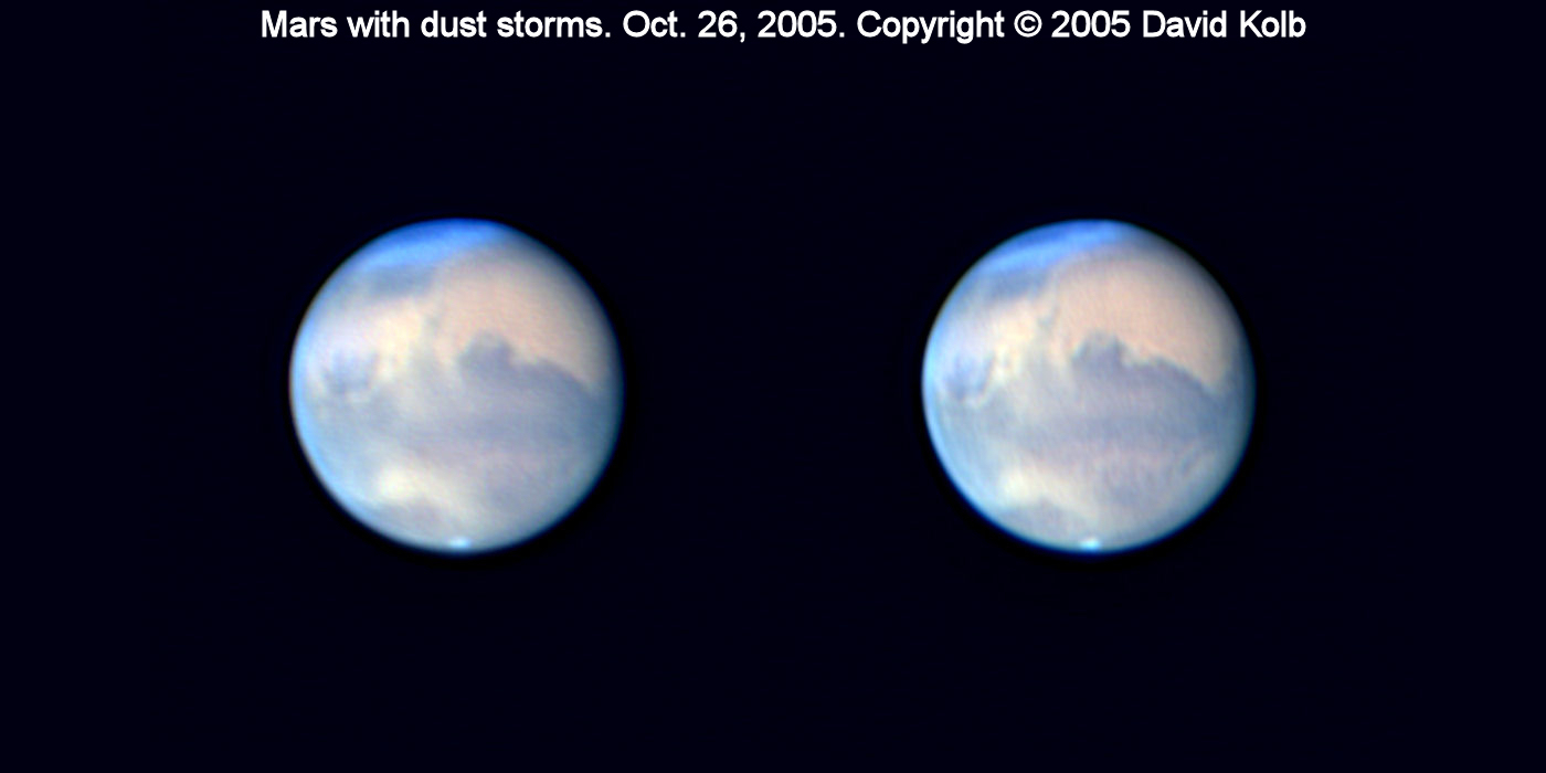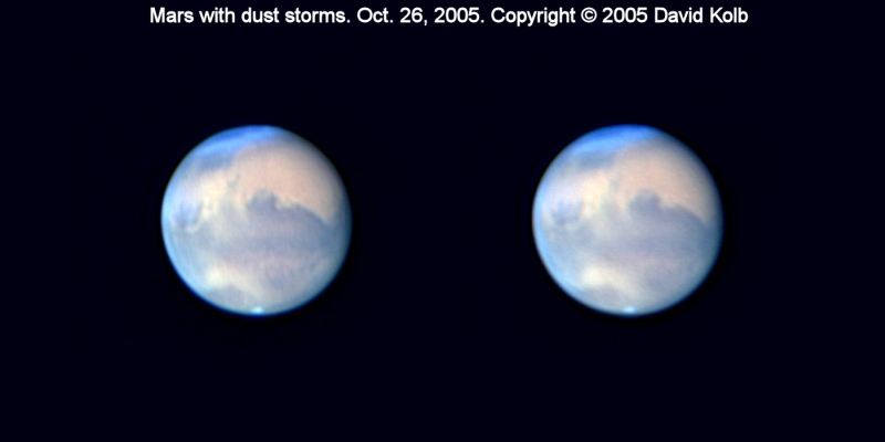 Mars Stereo Pair. Photographs taken with an 8" Meade LXD55 SCT and ToUcam Pro in 640x480 mode. The two images were captured on October 26, 2005 and show dust storms that were present at the time. I created a blank image in Paint Shop Pro and pasted the two Mars images in as separate layers so that I could easily adjust their spacing. The larger image is best viewed from a distance of 3/4 meter to 1 meter. The smaller image is best viewed at a distance of about 1/3 meter. Stare at the images so that they merge together by looking cross-eyed. Mars will then pop out in 3D. The third image is designed to be printed off for use in a stereo viewer.