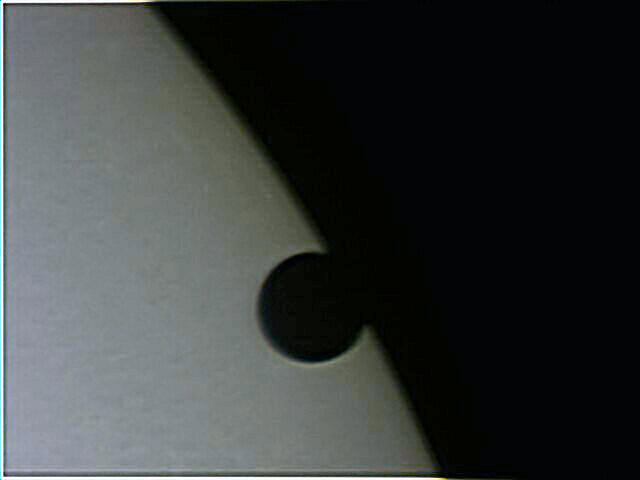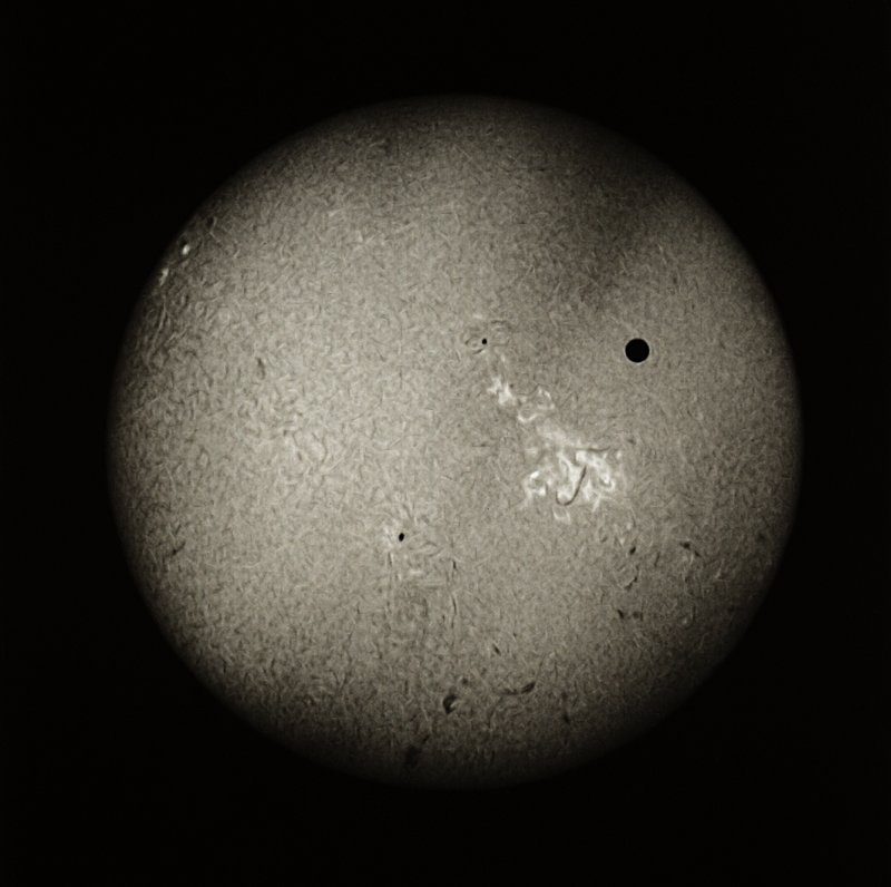 Venus transit photographed with a Coronado 60mm solar telescope and an Olympus OM1 using Kodak Technical Pan film. The dark bands in this photograph were produced by cirrus clouds that were present during the transit.