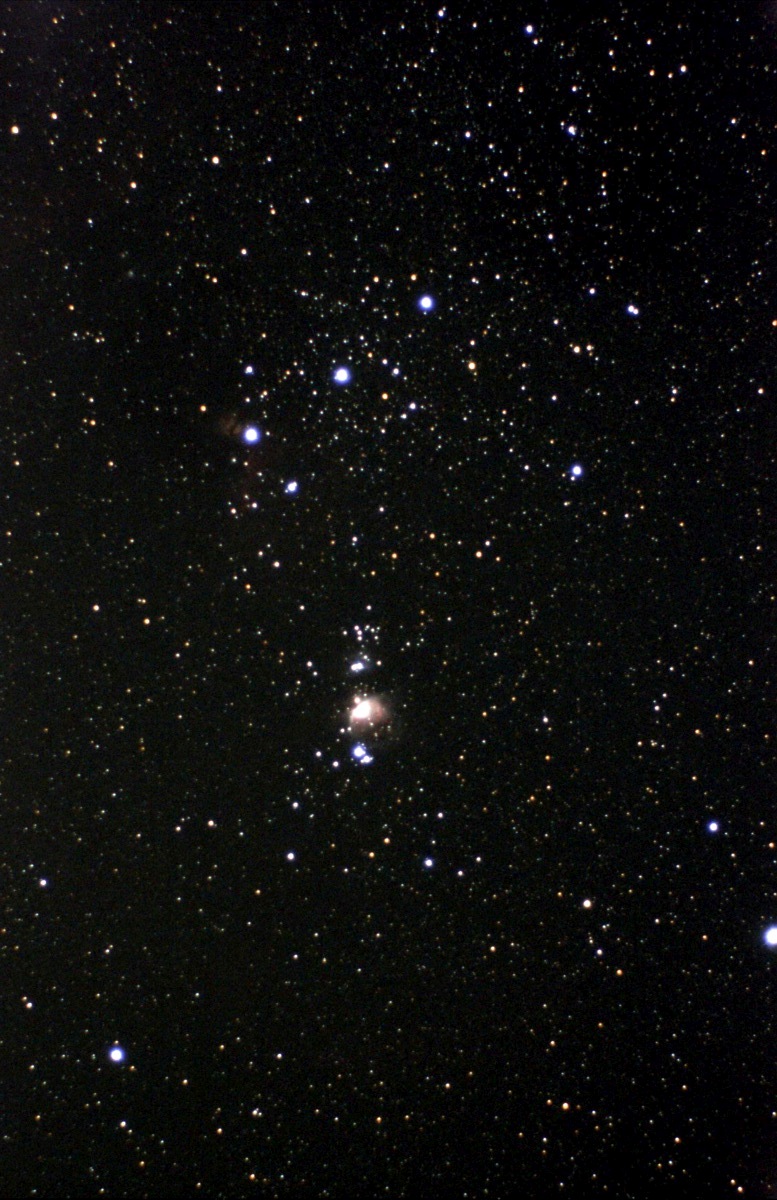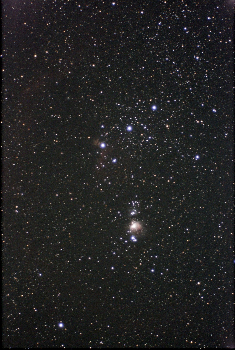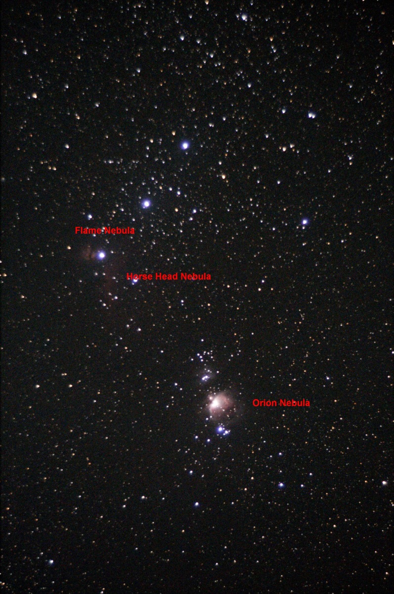 Photograph of the central portion of the constellation Orion that shows the Flame Nebula, Horsehead Nebula, Orion Nebula. This is a stack of 12 twenty second exposures that utilized a barn door tracker for guiding. This photograph was taken from the Baker Wetlands Discovery Center parking lot.