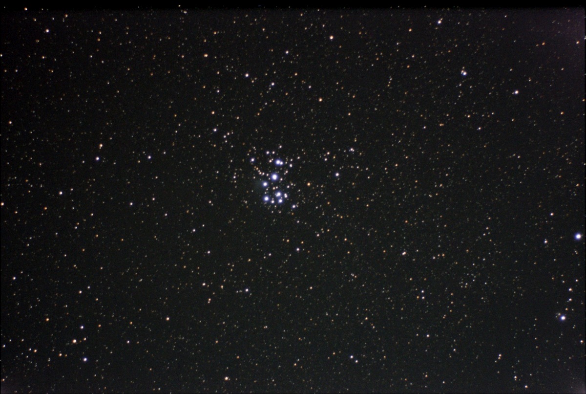 Photograph of the Pleiades star cluster using a barn door tracker. This photograph was taken from the Baker Wetlands Discovery Center parking lot.