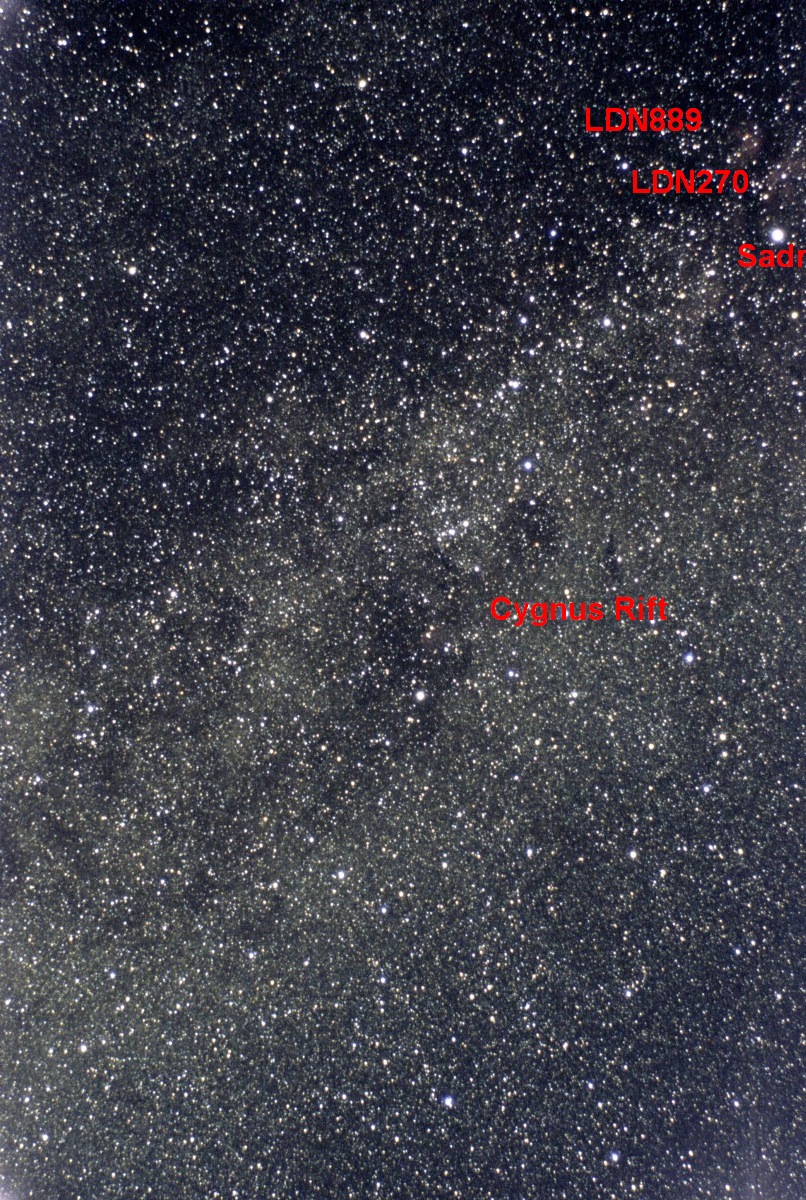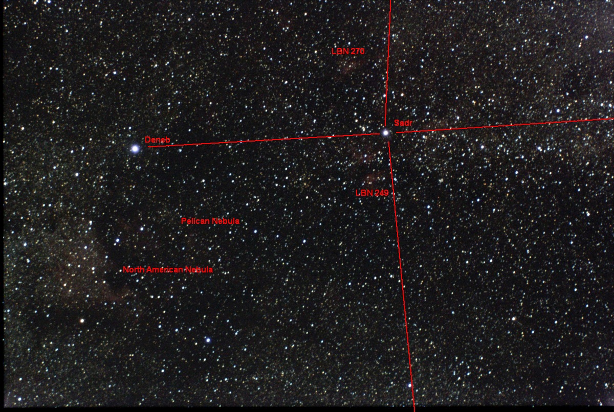 Photograph of the tail region of Cygnus showing Deneb, Sadr, North American Nebula, Pelican Nebula, and nebulae around Sadr. This picture is a stack of ten 20 second exposures. The picture was captured at the Bloomington East Park on Clinton Lake, near Lawrence, KS.