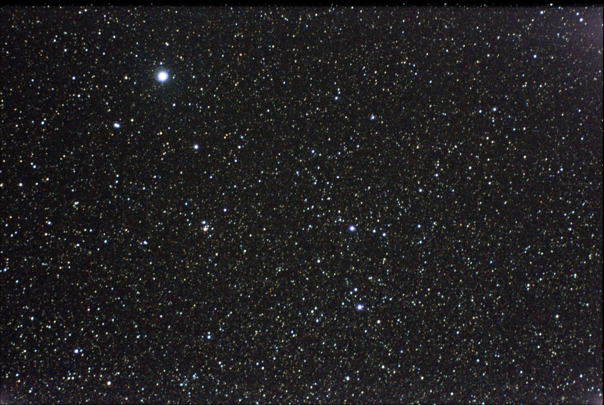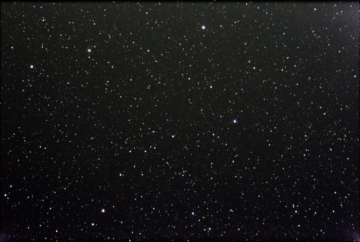 Unguided photograph of a region in Sagittarius. Five two second exposures were stacked to create this image. The Lagoon Nebula is visible to the upper right.