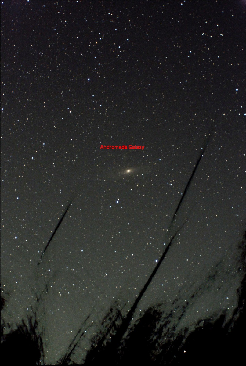 Photograph of the Andromeda Galaxy This picture is a stack of eight 20 second exposures. The black streaks are tree branches that have been distorted by the tracking. The picture was captured at the Bloomington East Park on Clinton Lake, near Lawrence, KS.