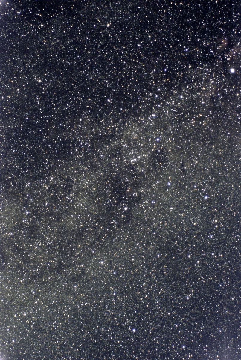 Photograph of the Milky Way in Cygnus showing the Cygnus Rift dark nebula. This picture is a stack of 38 fifteen second exposures. The picture was captured at Colyer Cemetery southwest of Lawrence, KS.