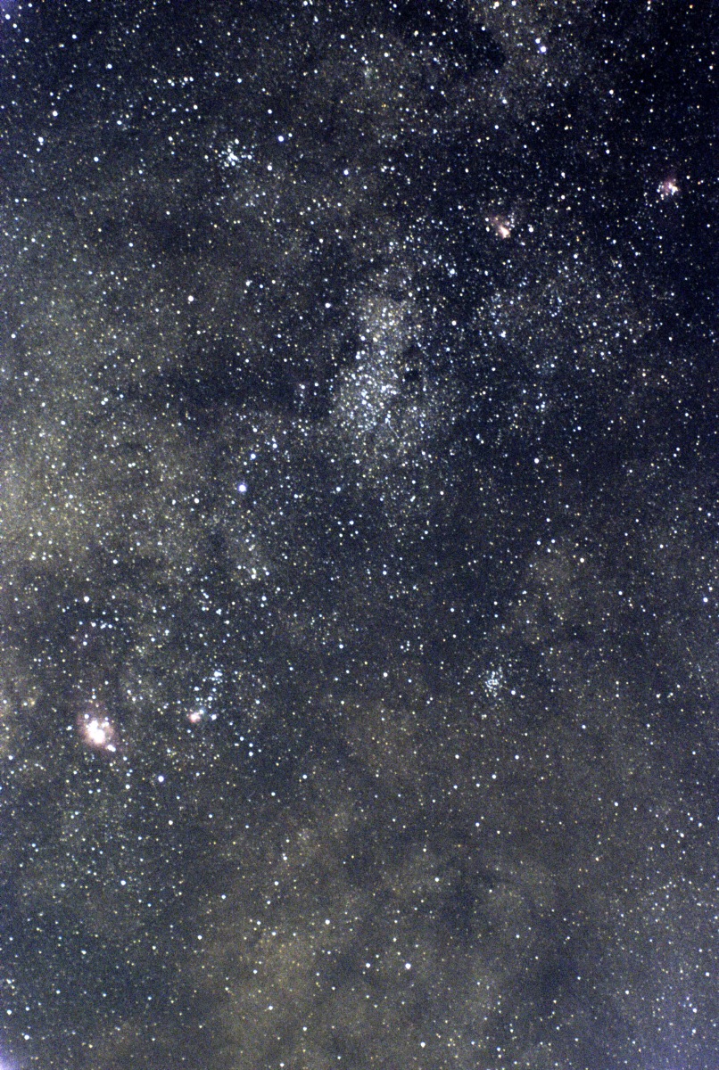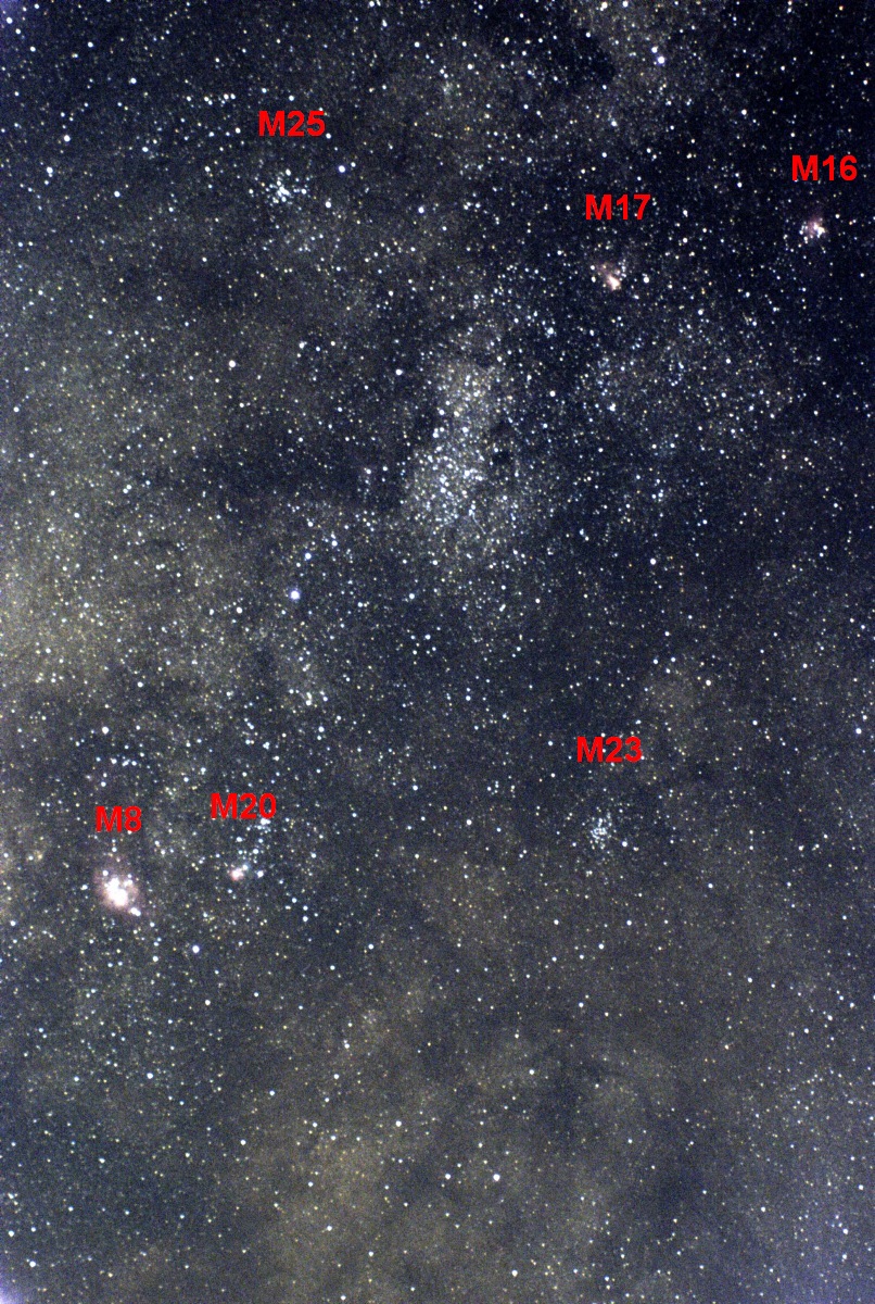 Photograph of the Milky Way in Sagittarius showing M16 (Eagle Nebula), M17 (Omega Nebula), M23 (open star cluster), M25 (open star cluster), M20 (Trifid Nebula), and M8 (Lagoon Nebula). This picture is a stack of 9 fifteen second exposures. The picture was captured at Colyer Cemetery southwest of Lawrence, KS.