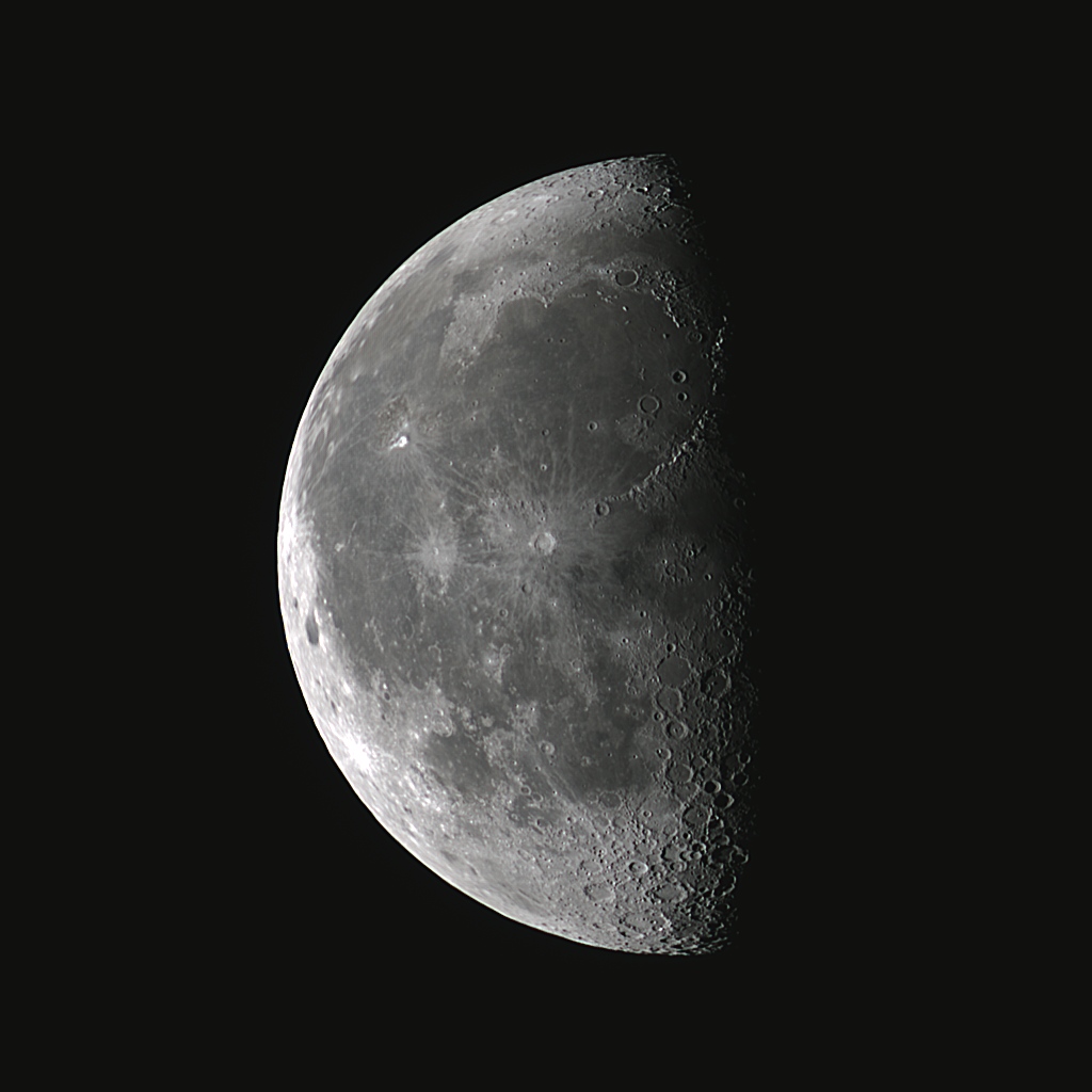 First quarter moon photographed with my homemade 5 inch refractor and a ZWO ASI1600MM camera. The exposure setting was 0.00094 seconds. This image consists of 53 still images stacked with AutoStakkert! and wavelets applied by AstroSurface.